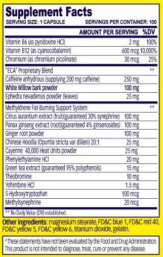 Вивільняючи жирні кислоти з жирових тканин, Cloma Pharma Methyldrene 25 постачає вас енергією! Змушує тіло виробляти тепло, автоматично збільшуючи обсяг витрачених калорій. Препарат містить виключно натуральні компоненти та речовини і так само збагачує організм вітамінами В6 і В12 і абсолютно нешкідливий для організму.