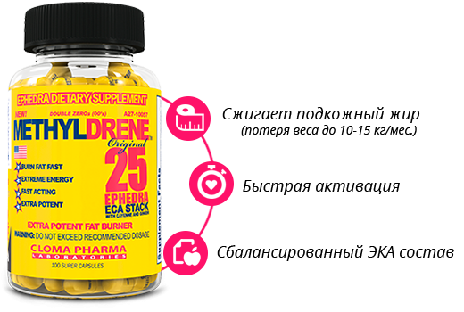 Відмінність Cloma Pharma Methyldrene 25 від подібних жіросжігателей, заснованих на эфедрине полягає в принципі «тихіше їдеш – далі будеш». Це ж просто чудово! Тільки уявіть, ваш жир спалюється протягом усього дня, а не в двох годинах після прийому, як з іншими препаратами!